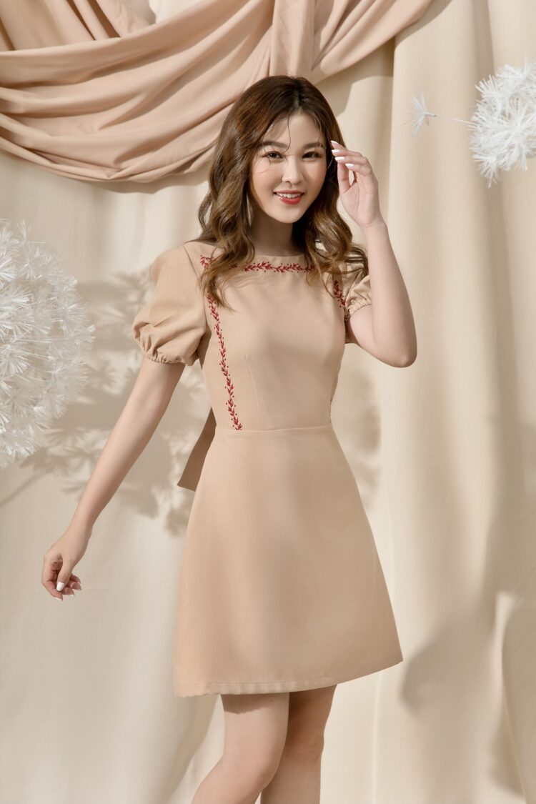 Đầm cam sữa cổ thuyền, hở lưng cột nơ sau, thêu quanh cổ và 2 sườn, tùng A tay con phồng